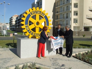 O monumento ao Rotary Internacional, uma roda amarela de 2 metros de diâmetro e 3 metros de altura, composta por seis braços e 24 dentes, fabricada em alumínio e assente em dois blocos de pedra, inseridos numa estrela de 5 pontos, foi inaugurado pelo Rotary Club das Caldas da Rainha a 20 de Abril, dia do seu 56º aniversário. Um acto inaugural que teve como objectivo assinalar o aniversário dos rotários das Caldas e que tem como símbolo “o nosso compromisso para com a sociedade”, sublinhou José Carlos Oliveira, o presidente deste clube. O monumento que está exposto na rotunda junto ao supermercado Modelo tem um significado muito forte “para os rotários e para os beneficiários das suas acções de solidariedade, de generosidade ou simplesmente para os que vêem nos rotários uma referência pelos seus valores, comportamentos éticos e morais, na sua comunidade e em todo o mundo”. A inauguração de este marco comemorativo nesta cidade vem perpetuar o serviço que ao longo de 56 anos o Rotary Clube de Caldas da Rainha tem feito na comunidade praticando o lema “Dar de si antes de pensar em si”. Cerca de meia centena de convidados fizeram questão de participar nesta festa em plena rua. Rotários de vários clubes, autarcas, todos amigos unidos pelo ideal de servir. Fernando Costa, presidente do Município das Caldas, que também fez anos nesse dia, elogiou o monumento e está seguro que daqui a uns meses a Rotunda que habitualmente é conhecida como a do Modelo será brevemente intitulada como a rotunda do Rotary. O descerramento do monumento foi levado a efeito pelo presidente do clube, José Carlos Oliveira, pelo presidente da Câmara Municipal, Fernando Costa, e Teresa Mayer, Governadora do Distrito Rotário 1960. Segundo o presidente do club, o monumento lembra todos os elementos do Rotary Club. “Isto é uma missão dos rotários antes nós, daqueles que cá estão e dos homens e mulheres que hão-de vir a estar, portanto, esta é a roda que passa por todas estas pessoas”. Sonho de há 14 anos, foi iniciado na presidência do rotário António Agostinho G. Coelho e Silva em 1994/95, quando foi pela primeira vez pedido um espaço público à Câmara Municipal para um monumento. A 28 Março de 2008, na presidência de Francisco Vogado, o projecto final foi apresentado à Câmara Municipal para aprovação. O monumento é uma ideia original do rotário José Capinha. O projecto de criação, concepção e arranjos exteriores foi da designer Susana Vogado. A Roda Rotária foi modelada e produzida conforme as determinações constantes no manual do Rotary Internacional, no que respeita à proporção da sua dimensão. A cor dominante da roda é amarela, porque, segundo o vice-presidente do clube das Caldas, Francisco Vogado, “transmite-nos calor, luz e descontracção”. A roda está assente em duas enormes pedras, representadas por dois blocos rugosos, e todo o conjunto foi inserido numa estrela de cinco pontos (pentagrama), símbolo da “protecção, da vontade e do bem”. Lateralmente estão instalados três mastros, onde no dia da inauguração foram desfraldadas as bandeiras da Fundação Rotária Portuguesa, do Rotary Internacional e da Câmara Municipal. No lado aposto, está previsto ser plantado um Dióspiro Kaki, de origem japonesa. A sua resistência à bomba nuclear de Hiroshima é “uma esperança para que nos dê força, para continuarmos defendendo e praticando os nossos valores, onde quer que estejamos”, referiu Francisco Vogado. O programa festivo contemplou ainda um jantar comemorativo no Restaurante A Lareira. Marlene Sousa