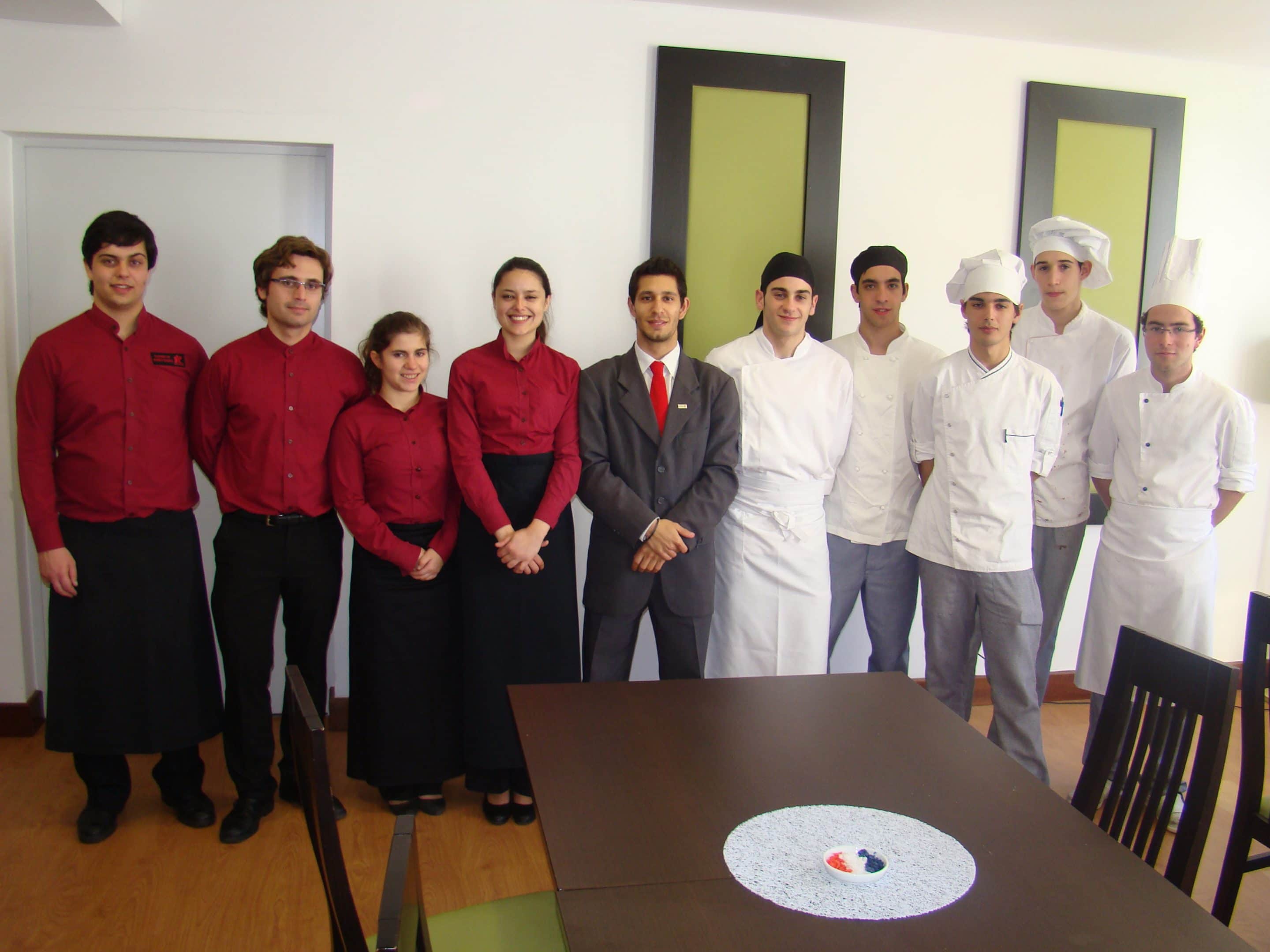 Os estudantes do curso de técnicas de restauração e bebidas encarregaram-se do serviço na sala: Patrícia Dias (escanção), Jorge Costa (chefe de sala), André Ferreira e Bárbara Santos (coordenação do bar), Daniela Ferreira e João Neves (serviço de sala).