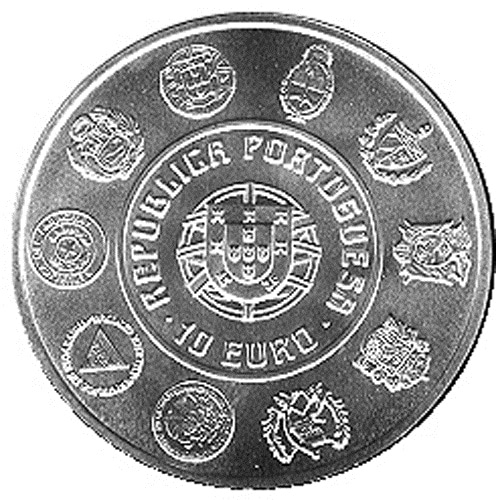 Anv: Apresenta no centro do campo e no círculo interior o escudo das armas nacionais sobreposto à esfera armilar, circundado pela legenda “República Portuguesa e o valor facial *10 EURO*, no círculo exterior a heráldica dos países ibéricos e ibero-americanos, aderentes a este evento, Portugal, Espanha, Argentina, Cuba, Equador, Guatemala, México, Nicarágua Paraguai e Perú.