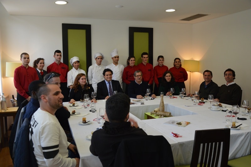 Neste almoço típico do Minho e Trás os Montes esteve presente o enólogo João Sardinha, responsável pela adega cooperativa de Alcanhões, que foi à EHTO dinamizar um workshop junto dos alunos sobre vinhos. Estiveram ainda presentes a diretora da Escola Superior de Artes e Design de Caldas da Rainha (ESAD.CR) Susana Rodrigues, e os colaboradores das oficinas técnicas da ESAD.CR, com o objetivo de continuarem a ser parceiros em várias atividades e iniciativas de interesse para ambas as escolas.