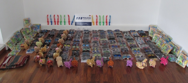 Foram apreendidos 292 óculos de sol, 26 peluches (cães), 14 espadas em plástico com líquido/bolhas de sabão com recarga, 35 pistolas em plástico com líquido/bolhas de sabão com recarga e um pano.