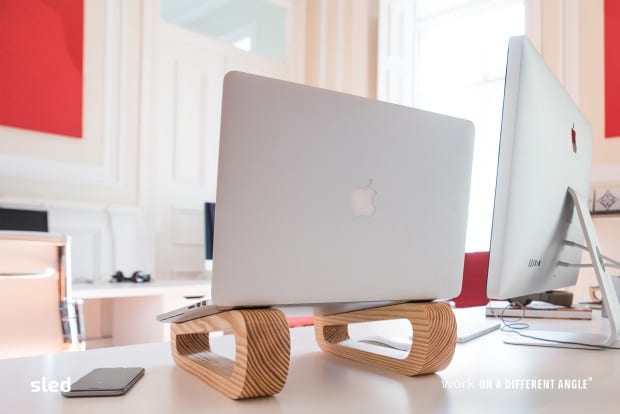 Um suporte para portáteis em madeira que permite a postura correta à secretária