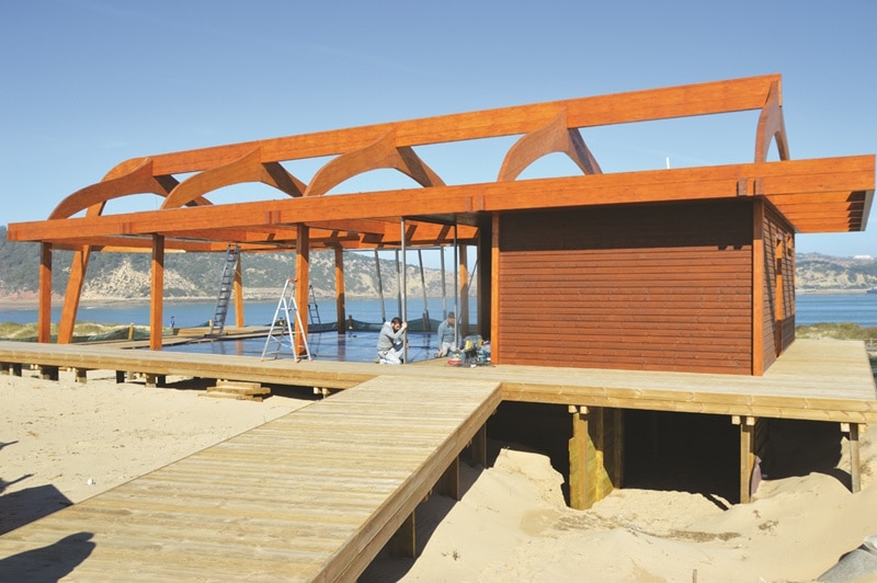 A estrutura totalmente construída em madeira simboliza um barco invertido e integra-se na paisagem natural da praia. É um projeto do arquiteto João Natividade.