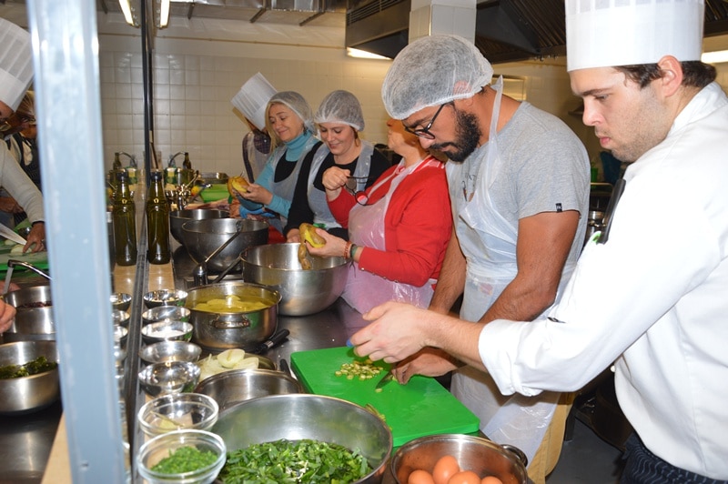 Foram os participantes que cozinharam com a ajuda dos formadores e alunos finalistas do curso de cozinha e pastelaria.