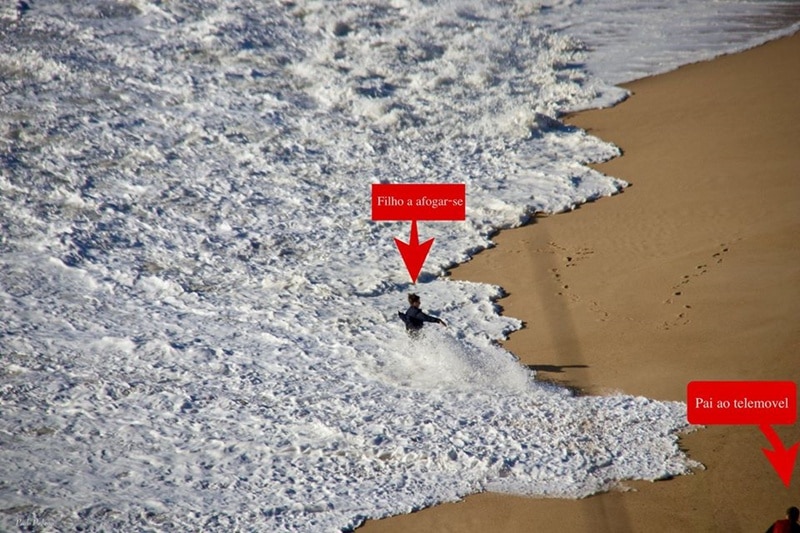 “Eram por volta das 16h30 e reparo que o miúdo estava muito perto do poderoso mar da Nazaré e o “pai” não largava o telemóvel e muitas vezes de costas para o mar (ambos). Eles deviam estar a uns 500 metros de mim e eu estava a uns 30 metros de altura (falésia do canhão) mas estavam a vir para a minha direção. Comecei a gritar e a assobiar e quando olhavam para mim eu gesticulava com os braços e aos berros para o miúdo se afastar da água”, descreveu Paulo Pinheiro. “Veio o momento fatídico, quando o miúdo está a posar para a foto que o pai lhe estava a tirar, surge por detrás dele uma rebentação mais forte que lhe ceifa as pernas e ele cai”, prosseguiu, adiantando que o rapaz foi engolido pela onda mas acabou a ser cuspido pela rebentação que o projetou para terra.
