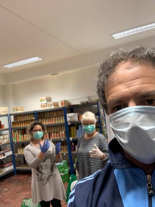 A entrega dos cabazes foi feita em dois turnos (manhã e à tarde), com a colaboração de dois ou três voluntários por vez, devidamente protegidos com batas, luvas e máscaras.
