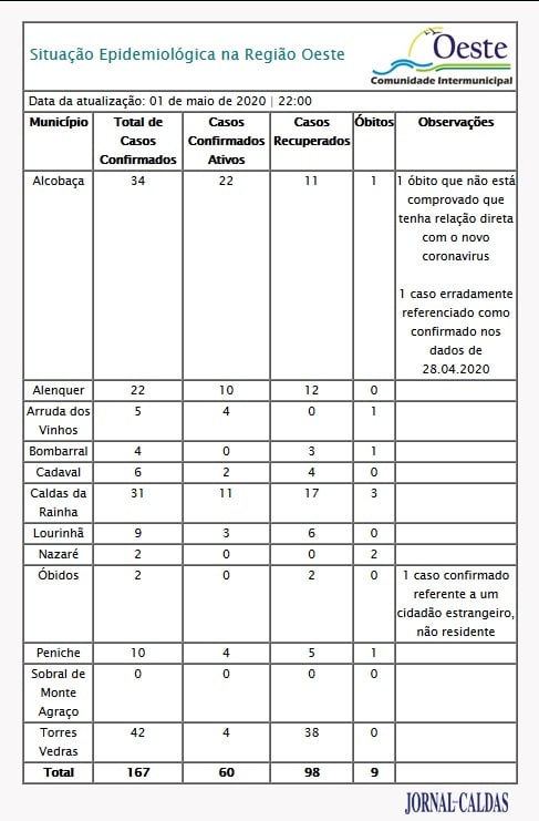 No dia 24 de abril foi registada uma morte em Alcobaça, inscrita na tabela de óbitos da situação epidemiológica apesar de a Câmara Municipal fazer constar que “não está comprovado que tenha relação direta com o novo coronavírus”.