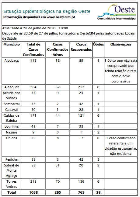 Entre 21 e 28 de julho mais uma morte associada à Covid-19 foi registada na região Oeste, em Torres Vedras (na freguesia de Santa Maria, São Pedro e Matacães), onde se verificaram desde o início da pandemia até agora seis óbitos, o mesmo número que nas Caldas da Rainha, sendo estes os dois municípios com mais falecimentos na região Oeste, onde já houve 28 mortos (cinco em Alcobaça, três em Peniche, dois em Sobral de Monte Agraço e Nazaré, e um em Arruda dos Vinhos, Bombarral, Cadaval e Lourinhã. Óbidos e Alenquer nunca tiveram falecimentos associados à Covid-19.