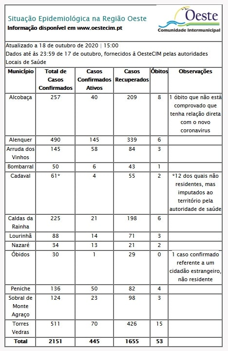 Em relação ao dia de ontem, o número de casos ativos passou de 452 para 445 (menos 7). Alenquer – 145 (mais 12), é o concelho que apresenta o maior número, seguindo-se Torres Vedras – 70 (mantém), Arruda dos Vinhos – 58 (mantém), Peniche – 50 (menos 5), Alcobaça – 40 (mantém), Sobral de Monte Agraço – 23 (menos 6), Caldas da Rainha – 21 (mais 1), Lourinhã – 14 (menos 3), Nazaré – 13 (mais 2), Bombarral – 6 (menos 7), Cadaval – 4 (menos 2) e Óbidos – 1 (mais 1).