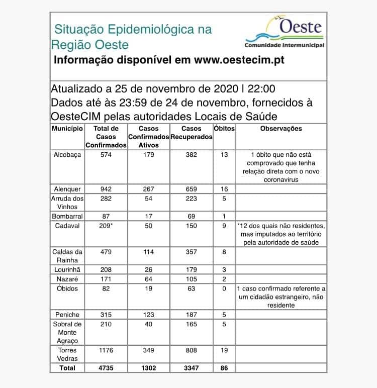 O número de casos ativos de Covid-19 na região Oeste é agora 1302. Torres Vedras, com 349, é o concelho que apresenta o maior número, seguindo-se Alenquer – 267, Alcobaça – 179, Peniche – 123, Caldas da Rainha – 114, Nazaré – 64, Arruda dos Vinhos – 54, Cadaval – 50, Sobral de Monte Agraço – 40, Lourinhã – 26, Óbidos – 19 e Bombarral – 17.