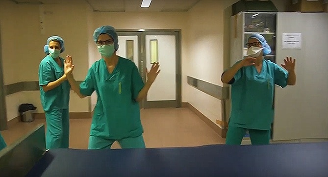 Num momento descontraído os profissionais de saúde fazem coreografias de dança.