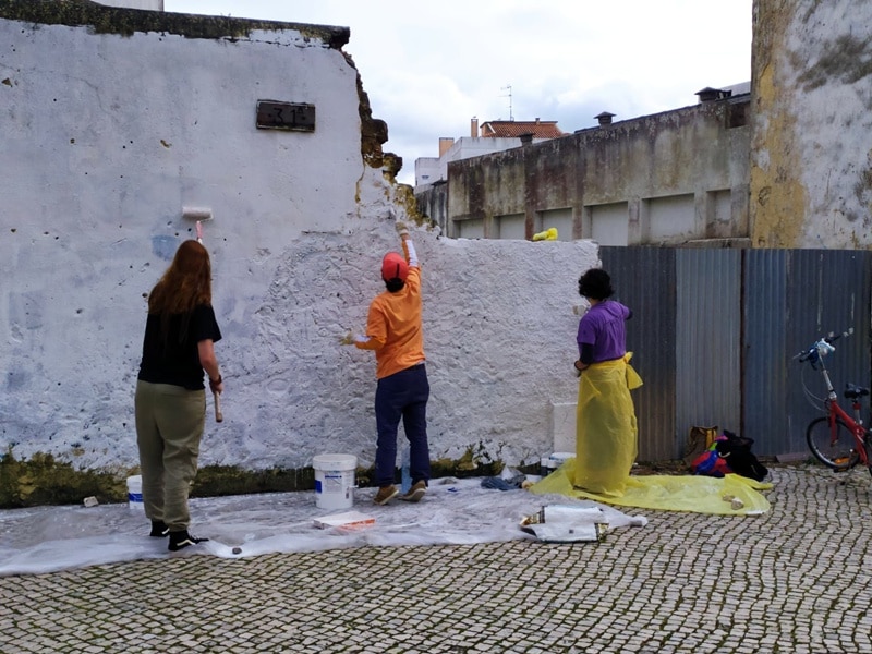 Os jovens a pintar o mural na Avenida 1º de Maio, nº 31A
