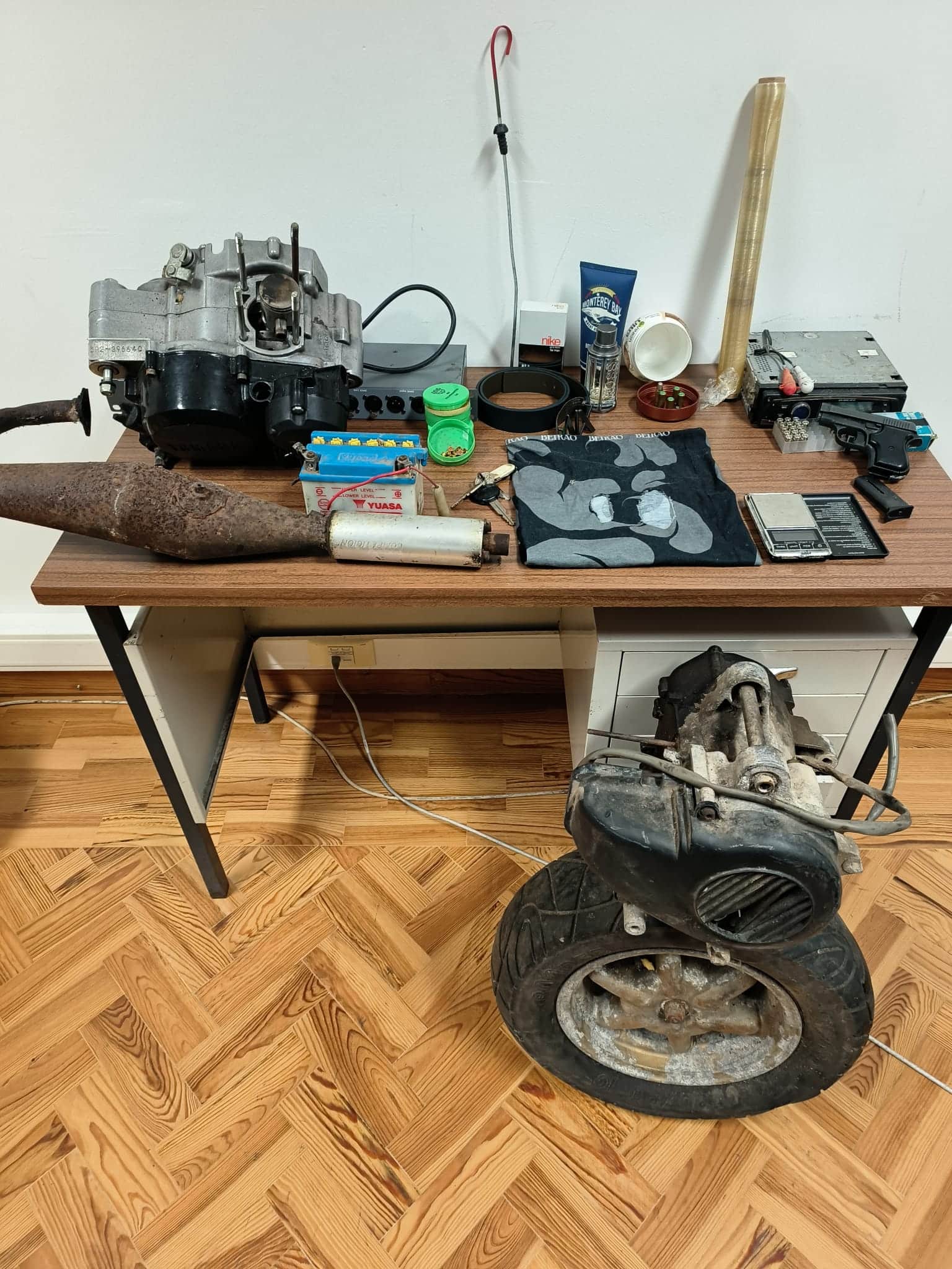 Após uma busca domiciliária foram apreendidas doze doses de haxixe, uma balança de precisão, uma arma de alarme e 31 munições. Foram igualmente recolhidos pela GNR um auto-rádio, dois motores, componentes de motores e duas baterias de motociclos, para além de diversas ferramentas.
