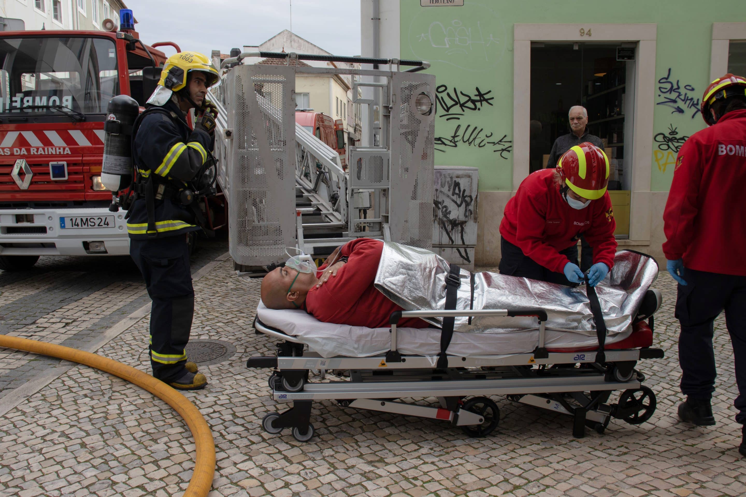 Nessa saída para o exterior um colaborador acabaria por ficar barrado pelo fumo no segundo piso e teve de ser retirado pelos bombeiros com recurso à autoescada. Após o resgate, devido à inalação de fumos, foi assistido e transportado ao hospital. Este foi o cenário criado para verificar os procedimentos dos próprios colaboradores no âmbito das medidas de autoproteção constantes do plano de emergência.