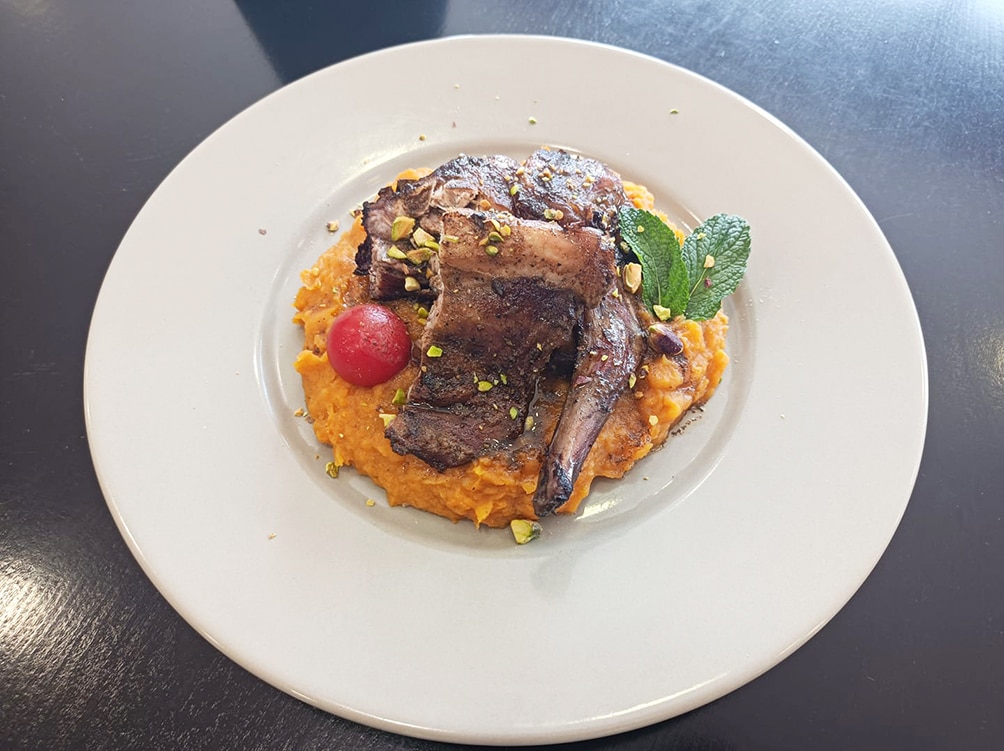 Coelho no forno com puré de batata doce e pistácio da Casa da Lú
