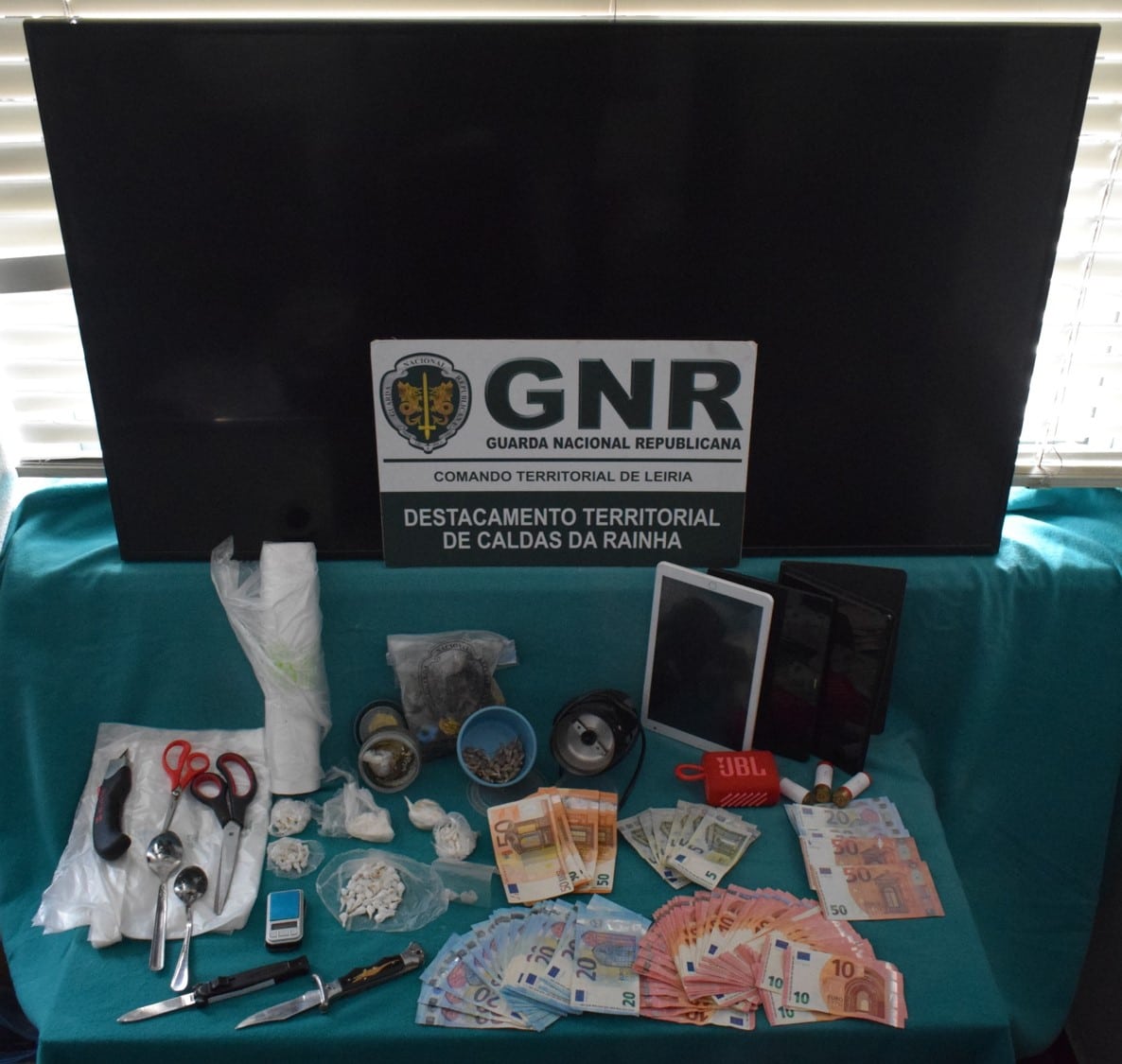 Armas e dinheiro foram igualmente apreendidos: Uma faca de abertura automática (proibida), duas munições, 1.184 euros e seis notas falsificadas.