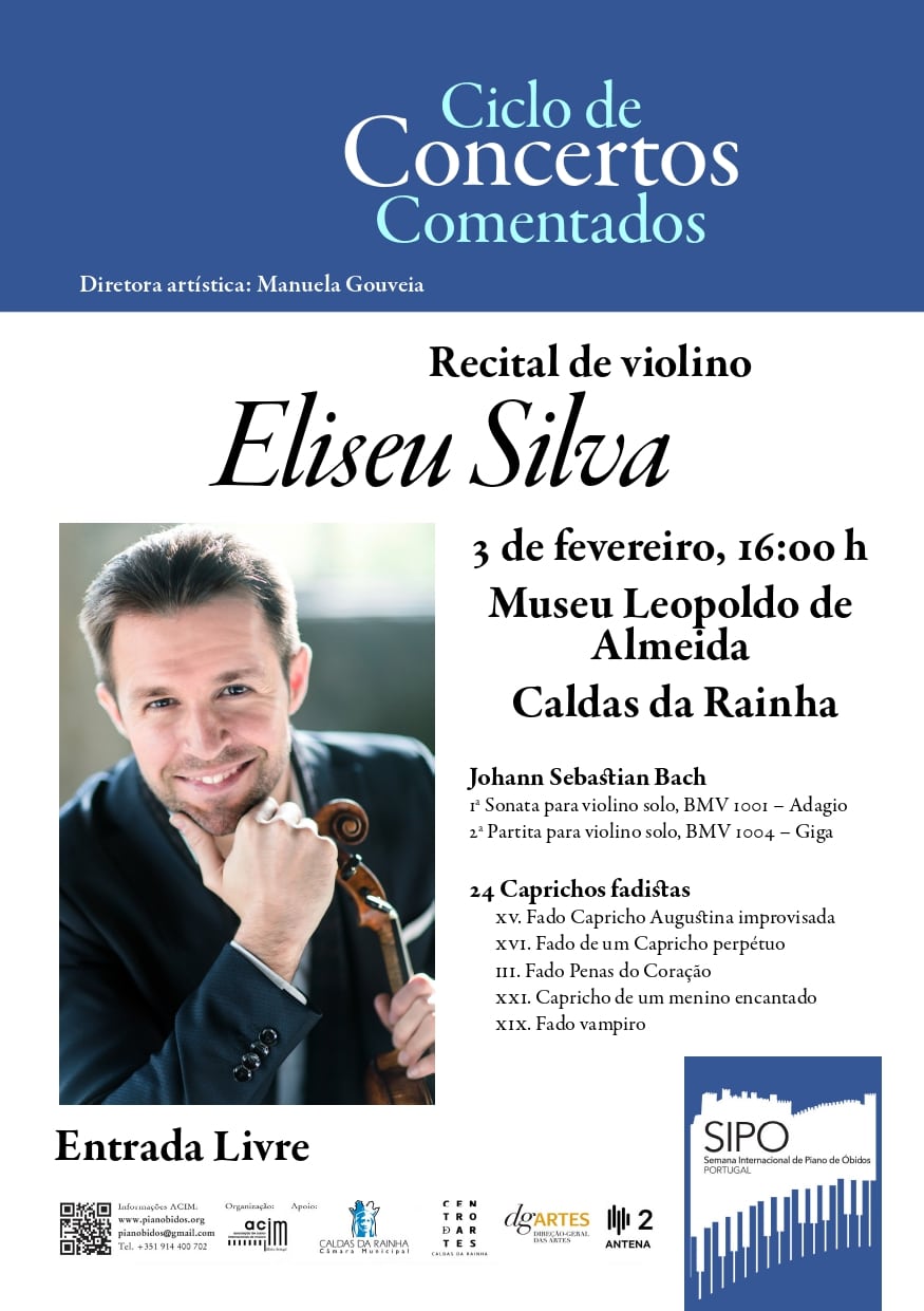 O Museu Leopoldo de Almeida, nas Caldas da Rainha, recebe no dia 3 de fevereiro, pelas 16h00, um recital de violino com Eliseu Silva, no âmbito do ciclo de concertos comentados, com direção artística de Manuela Gouveia.