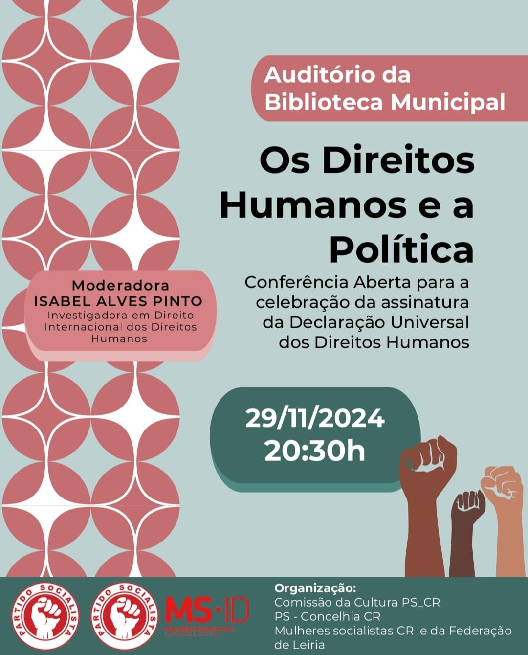 A Concelhia das Mulheres Socialistas – Igualdade e Direitos (MS-ID) das Caldas da Rainha, a Concelhia do Partido Socialista (PS) das Caldas da Rainha e a Federação Distrital de Leiria das MS-ID realizam uma conferência dedicada ao tema “Os Direitos Humanos e a Política”.
