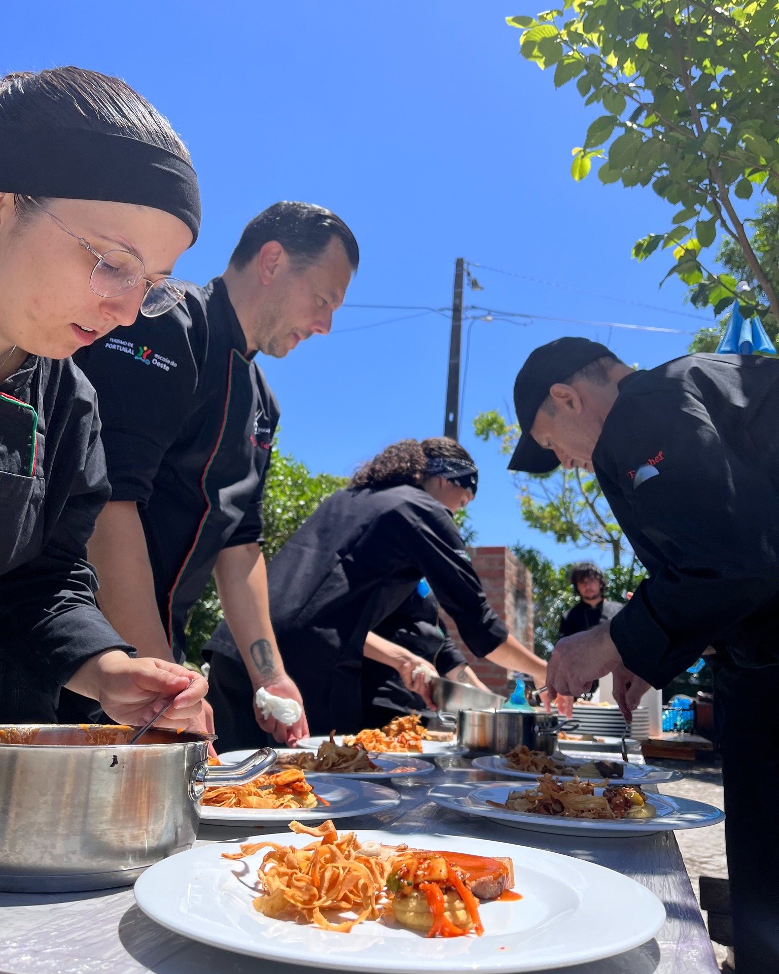 O resultado da formação destes alunos transmitiu-se num serviço atencioso e em boa comida. A entrada foi uma espetada de legumes na brasa, o prato de peixe foi robalo ao sal com mini legumes na brasa, seguindo-se barriga de porco na brasa com puré de tremoço, cherivia frita e kimchi de pêra rocha do Oeste e o prato de caça, perna de javali na brasa com arroz de forno. Para finalizar, não faltou o doce, sendo a sobremesa um folhado de pêra rocha do Oeste com mousse de ginja. Cada um dos pratos foi explicado pelos alunos responsáveis, previamente a serem servidos à mesa.