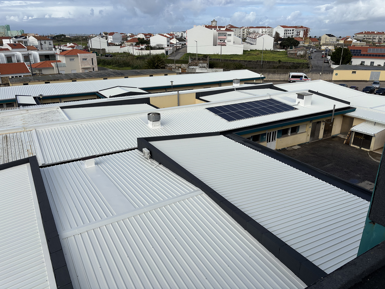A obra consistiu na remoção integral das coberturas existentes em painéis de fibrocimento, que foram substituídas por materiais mais adequados, permitindo uma melhoria significativa das condições de isolamento térmico e de impermeabilização do edifício, em conformidade com as exigências técnicas e regulamentares em vigor.